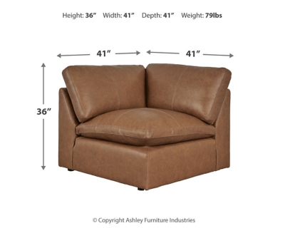 Series Features:Modular leather sectional with all sides finished and no connectors, so each piece can float anywhere in a room. Upholstered in a semi aniline caramel leather with leather match. Attached seat cushions with loose, non-reversible back cushions with perforated material to allow for breath ability of the leather. Loose feather/fiber blend arm bolster pillow to enhance comfort with perforated material on the back of the pillows for breath ability. Seat cushions with feather/fiber blend encasing a foam core and non-skid legs.